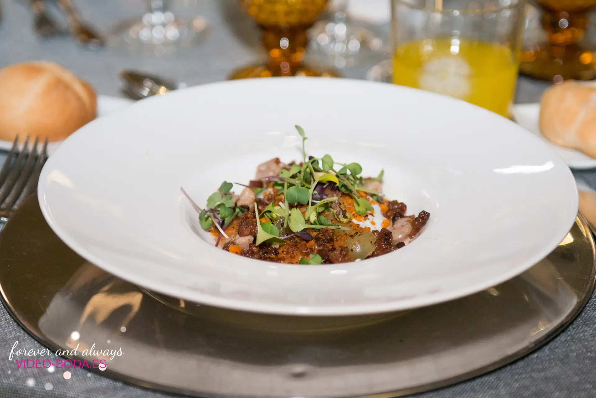 El coktail fue por las instalaciones interiores, en la boda de Aldamar, muy recogido por que el tiempo no acompañó para hacerlo fuera. Después pasamos al salón a comer, un salón precioso, amplio y bien iluminado. Una de las cosas que más ilusión le hacía a la pareja era los centros de mesa de Vendrell, cosa rara, pero estaban muy ilusionados con ellos. Los platos de comida fueron riquísimos desde las migas a la carne, pasando por la torrija con helado.