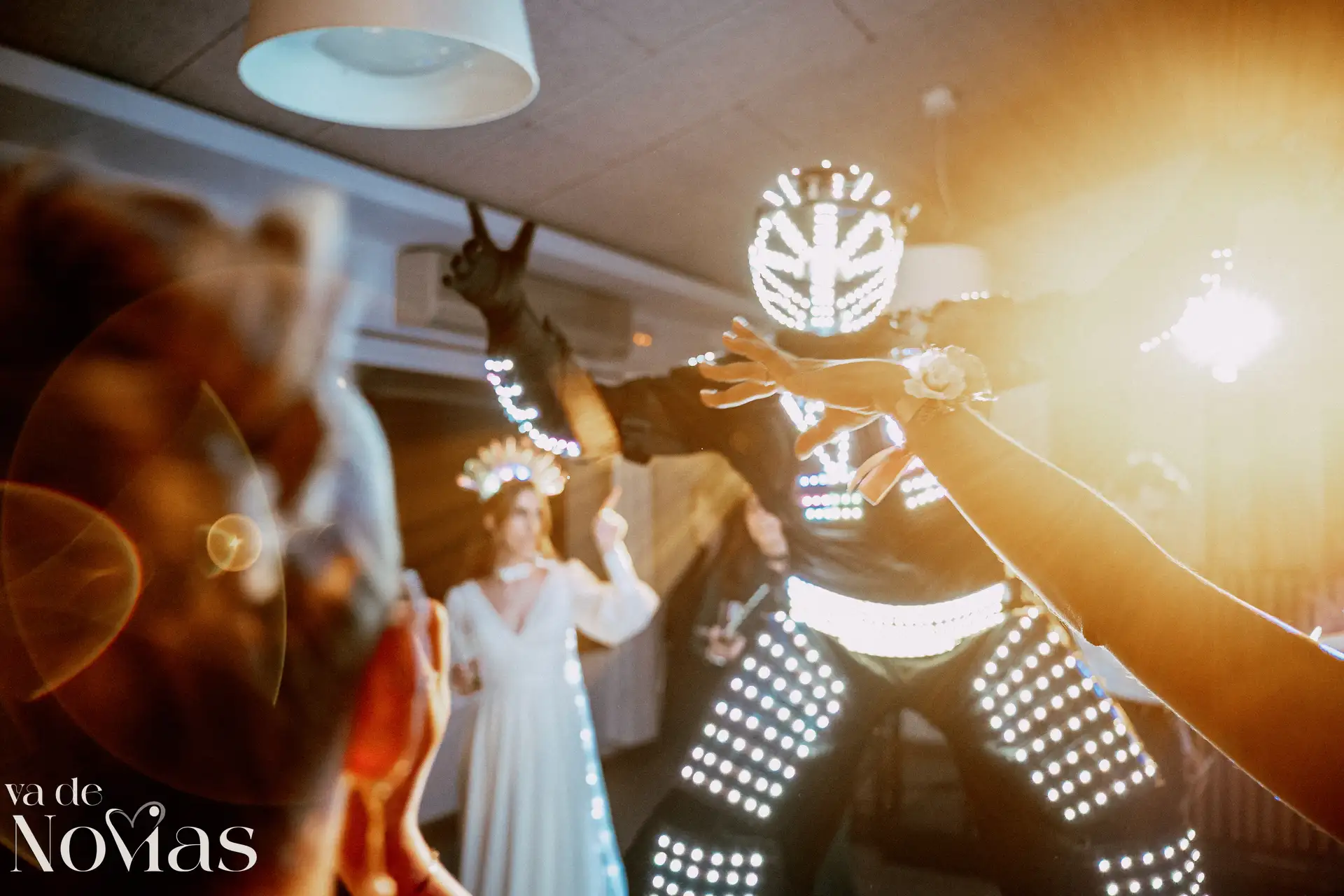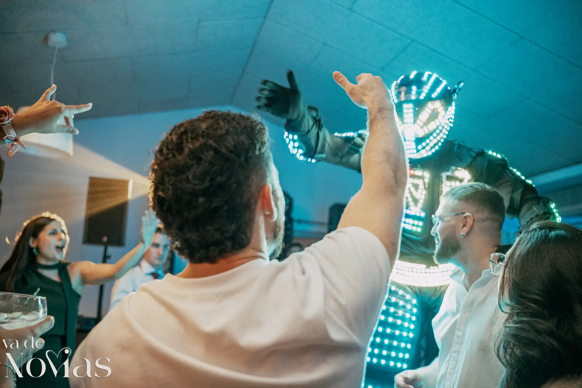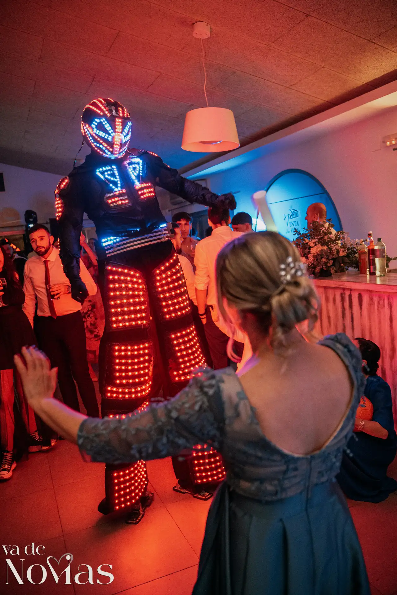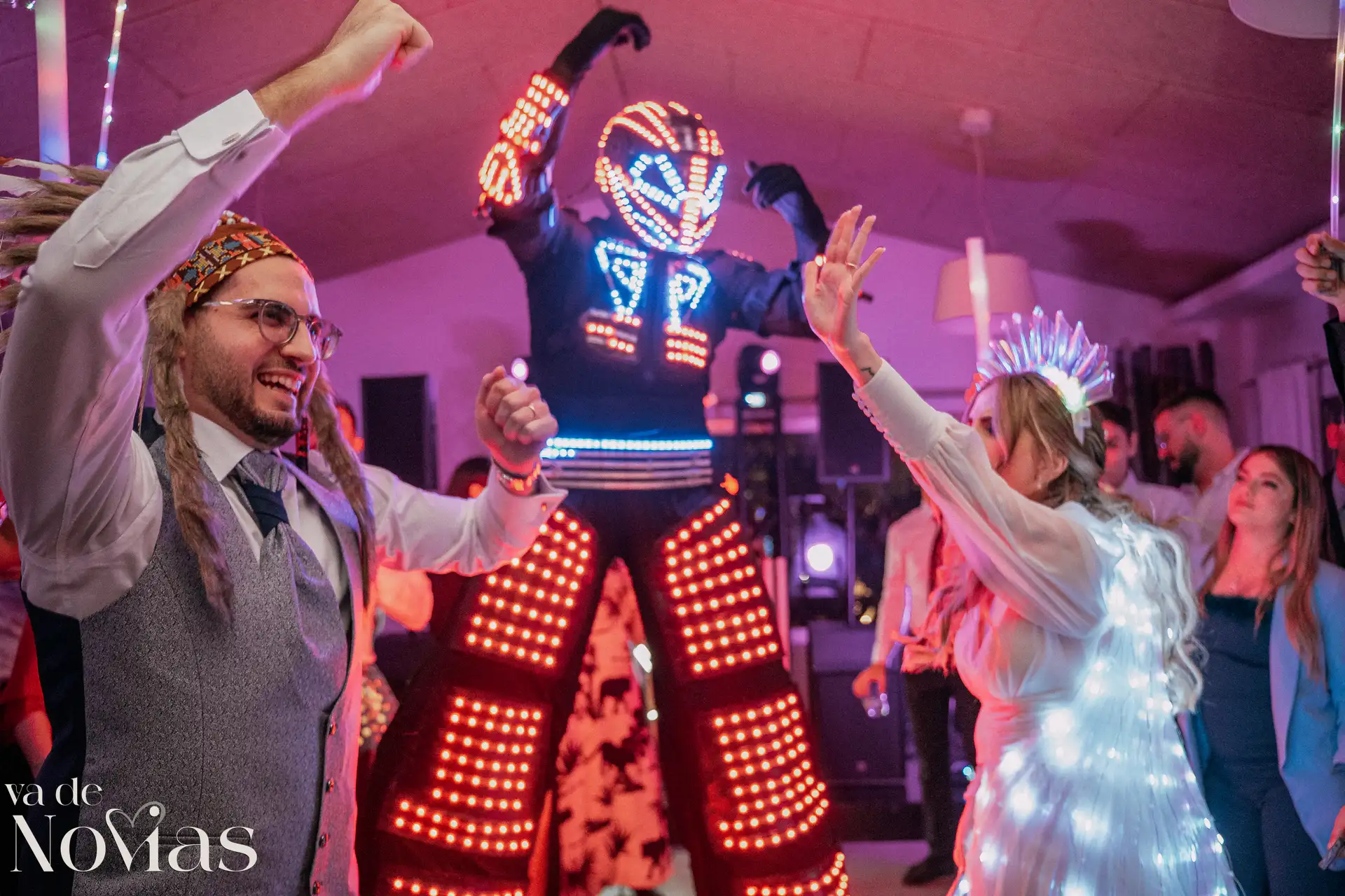 La noche fue para inaugurarlo por todo lo alto. Sandra y Carlos no querían una fiesta cualquiera; querían un "gran fiestón", y vaya si lo consiguieron. Bajo la luz vibrante y preciosa de la discomóvil de Sona, la noche ya prometía, pero entonces llegó el momento de la hora feliz. Los amigos, junto a los propios novios, desaparecieron un instante para volver disfrazados y de repente, irrumpió en la pista un titán de casi tres metros: un robot espectacular que se convirtió en el epicentro de la "Hora Loca". El artista detrás del robot trabajó sin descanso, con una entrega admirable para que la experiencia fuera inolvidable, generando fotografías y momentos épicos que quedarán para siempre como el reflejo de una celebración memorable, divertida y maravillosamente loca.