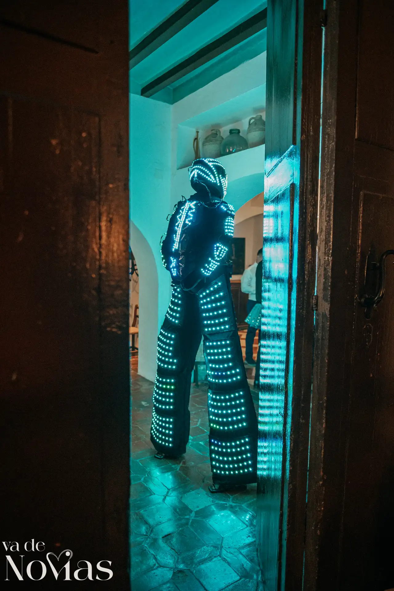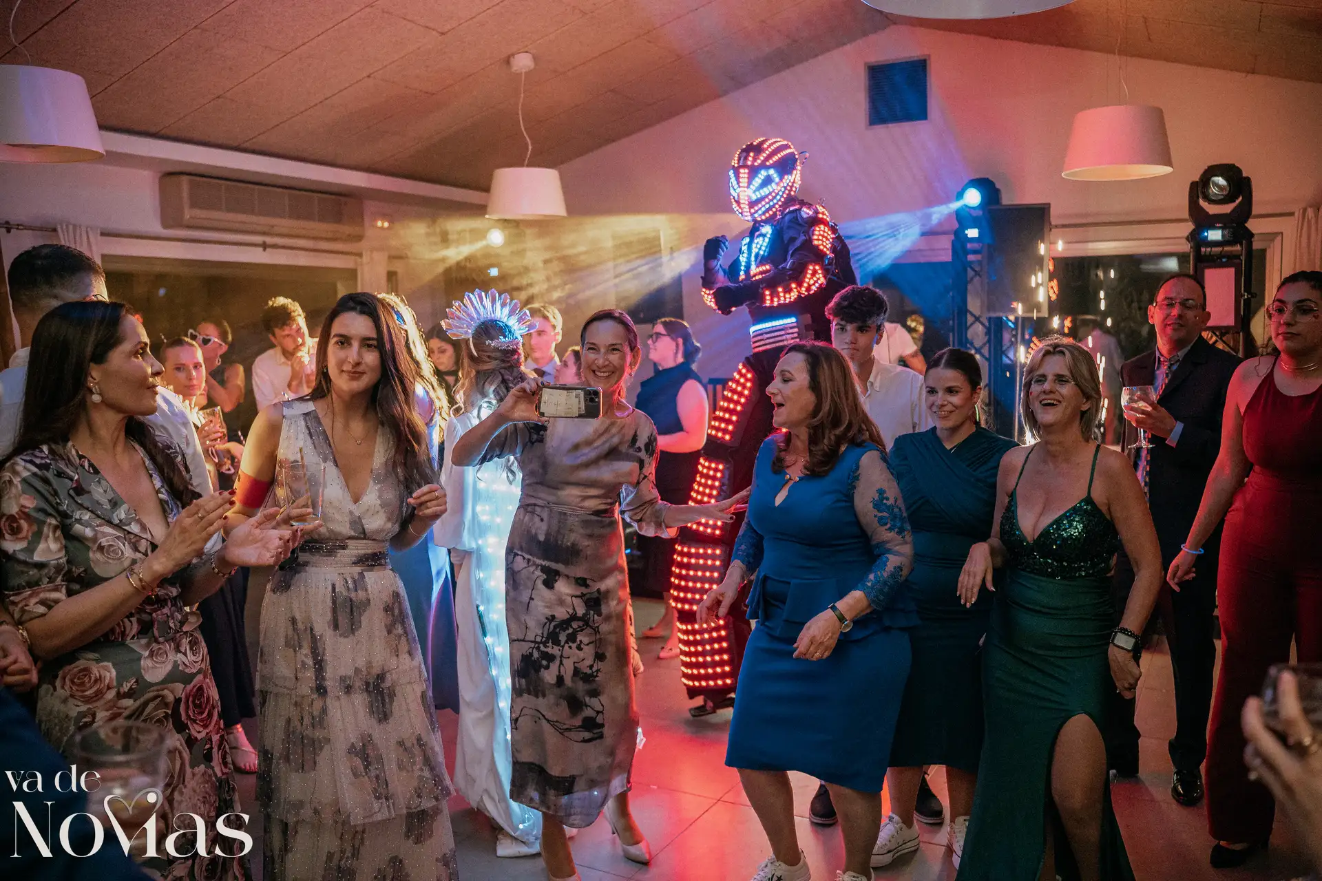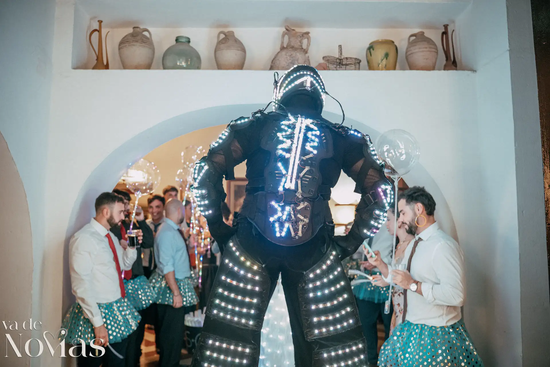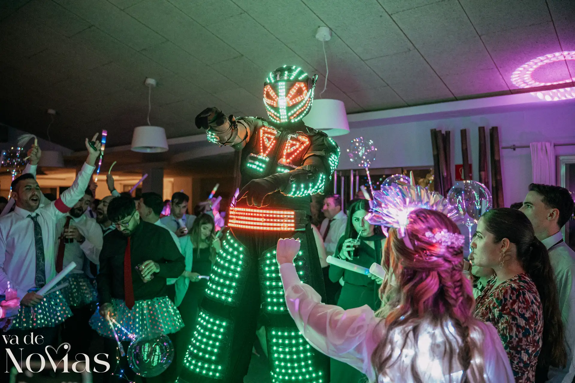 La noche fue para inaugurarlo por todo lo alto. Sandra y Carlos no querían una fiesta cualquiera; querían un "gran fiestón", y vaya si lo consiguieron. Bajo la luz vibrante y preciosa de la discomóvil de Sona, la noche ya prometía, pero entonces llegó el momento de la hora feliz. Los amigos, junto a los propios novios, desaparecieron un instante para volver disfrazados y de repente, irrumpió en la pista un titán de casi tres metros: un robot espectacular que se convirtió en el epicentro de la "Hora Loca". El artista detrás del robot trabajó sin descanso, con una entrega admirable para que la experiencia fuera inolvidable, generando fotografías y momentos épicos que quedarán para siempre como el reflejo de una celebración memorable, divertida y maravillosamente loca.