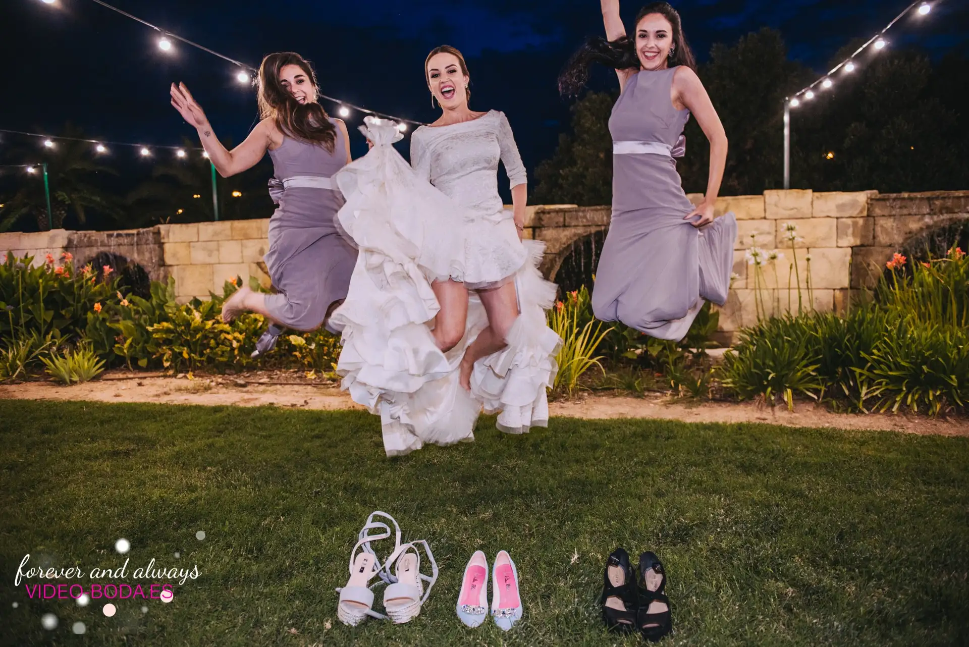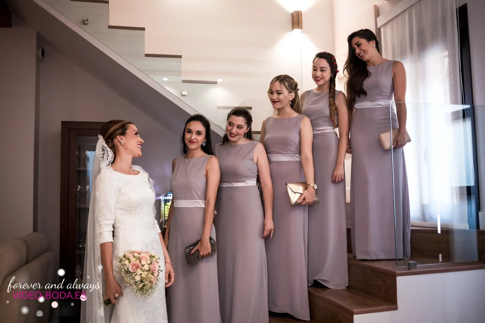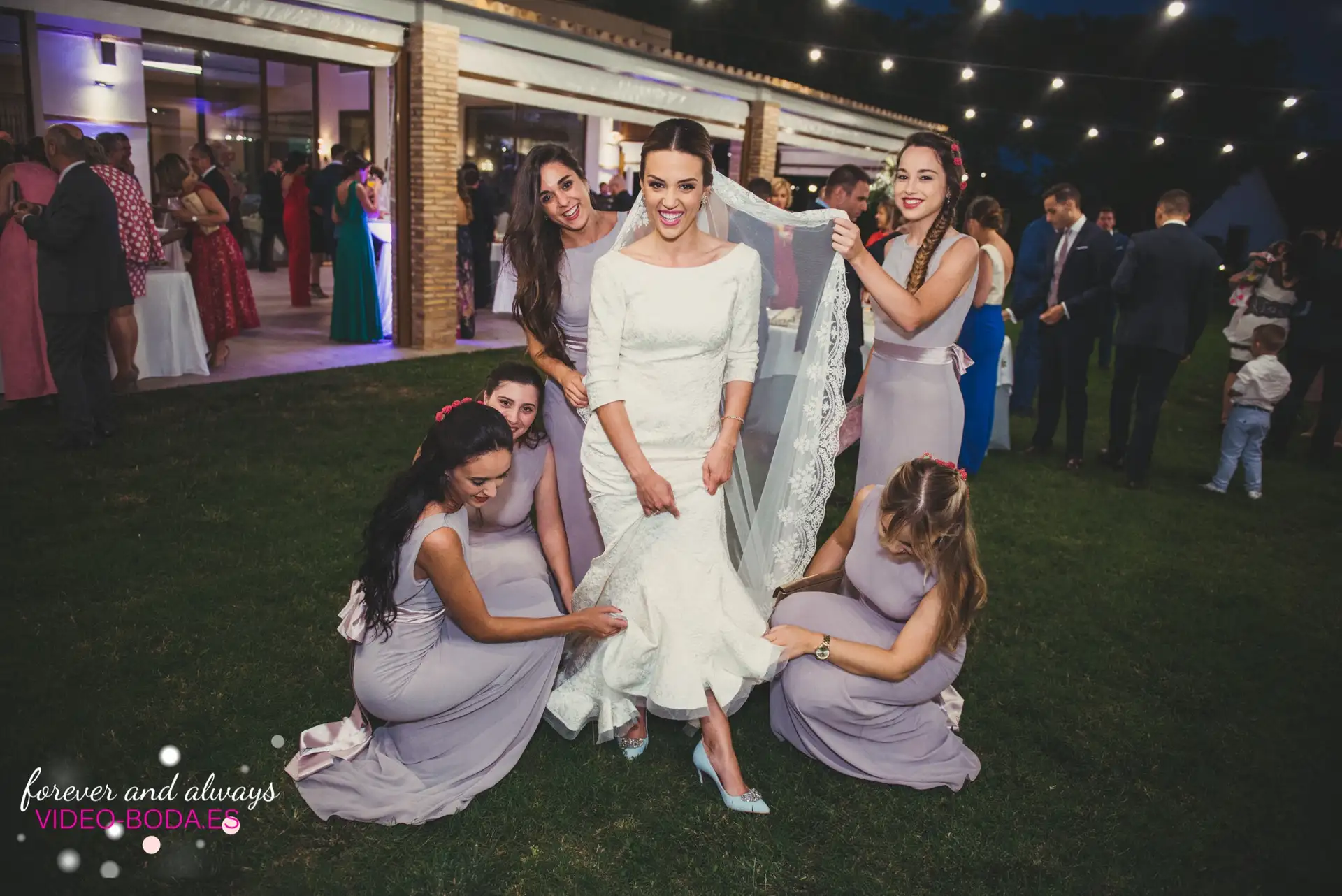 En esta boda la novia tenía nada menos que seis damas de honor con trajes en una tonalidad de violeta claro que lucían muy bien en las fotos y empastaban perfectamente en torno a la novia a la que hacían destacar, con su impecable traje blanco. Se trataba de amigas de la infancia, un grupo muy bien avenido que nos hizo sonreír en más de una ocasión y que sorprendieron a Nuria con sus emocionados discursos tras la cena.
