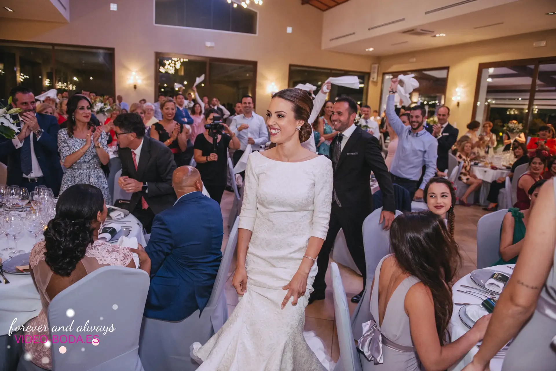 En un momento de la noche los novios mostraron su cara más apasionada y se lanzaron a cantar al ritmo del grupo flamenco que amenizaba el cóctel. La familia y amigos improvisaron un corro y todos pudimos disfrutar del arte de la pareja en esta improvisada actuación. Para video-boda.es, momentos como estos son oro por su espontaneidad y fuerza visual.